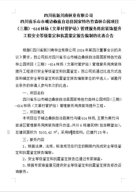 四川省新川南林业有限公司614林场(文革村管护站)管理服务用房装饰提升工程安全等级鉴定和抗震鉴定报告编制的比选公告