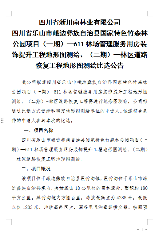 四川省新川南林业有限公司四川省乐山市峨边彝族自治县国家特色竹森林公园项目(一期)–611林场管理服务用房装饰提升工程实施方案、(二期)-林区道路恢复工程地形图测绘