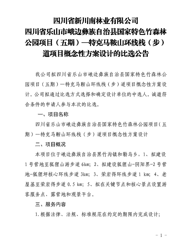 四川省新川南林业有限公司四川省乐山市峨边彝族自治县国家特色竹森林公园项目(五期)—特克马鞍山环线栈(步)道项目概念性方案设计的比选公告