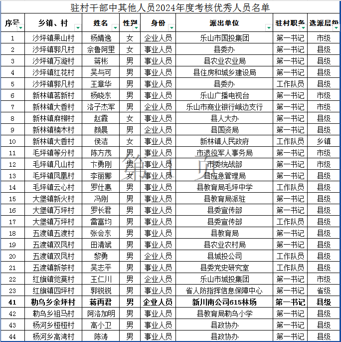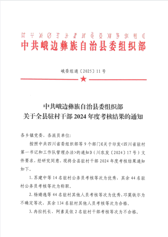 近日,峨边县委组织部下发了《关于全县驻村干部2024年度考核结果的通知》(峨委组通〔2025〕11号),公司615林场选派至勒乌乡余坪村的第一书记蒋再君同志获全县驻村干部2024年度考核“优秀”等次!